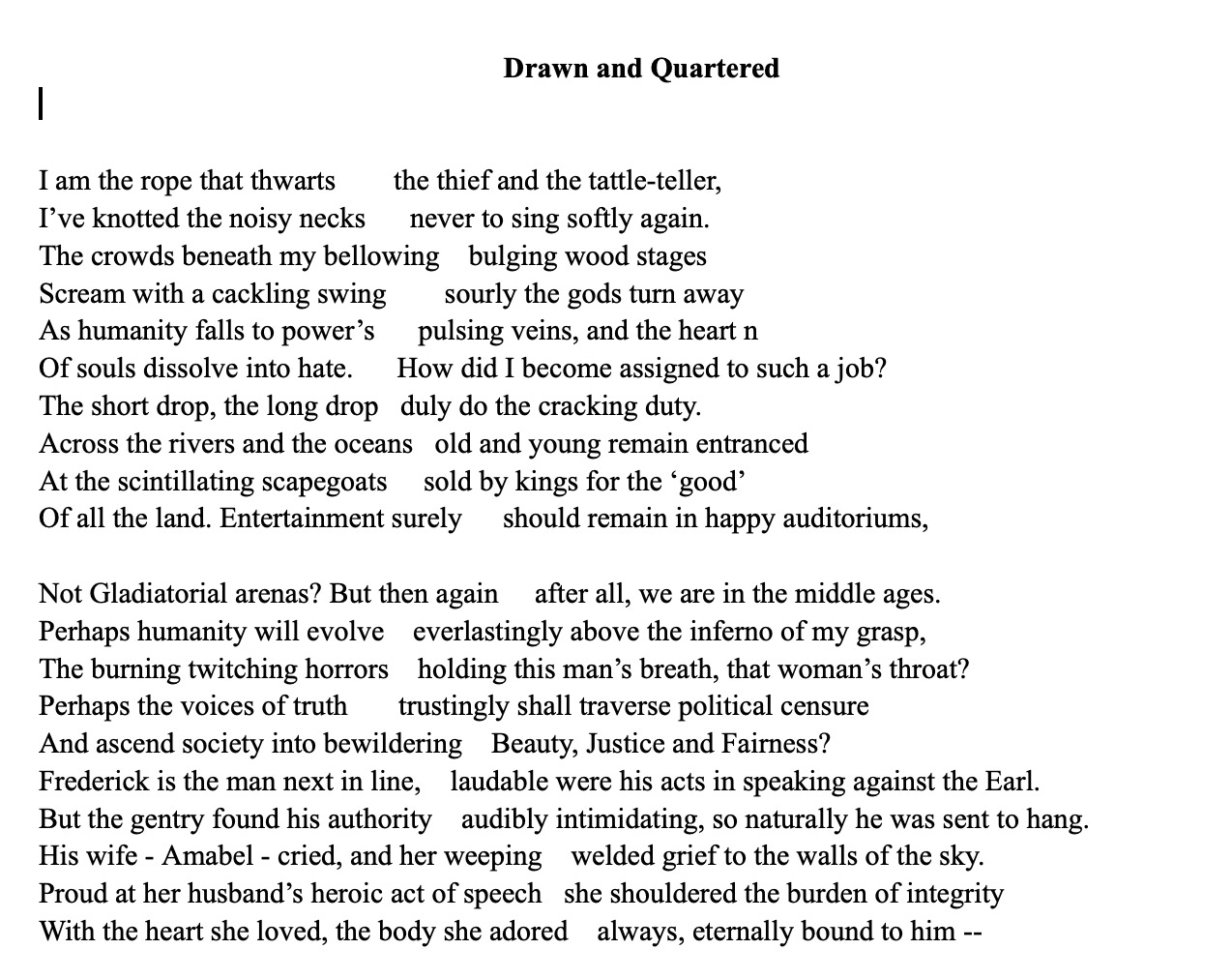 In alignment with the paganistic animism within Old English poetry, the rope is personified in the text. Such examples of this animism can be seen in Dream of the Rood. The overarching warriorship, conceptual depictions of scapegoating, and grief are ever-present in the Old English corpus, and are thus included within Drawn and Quartered.